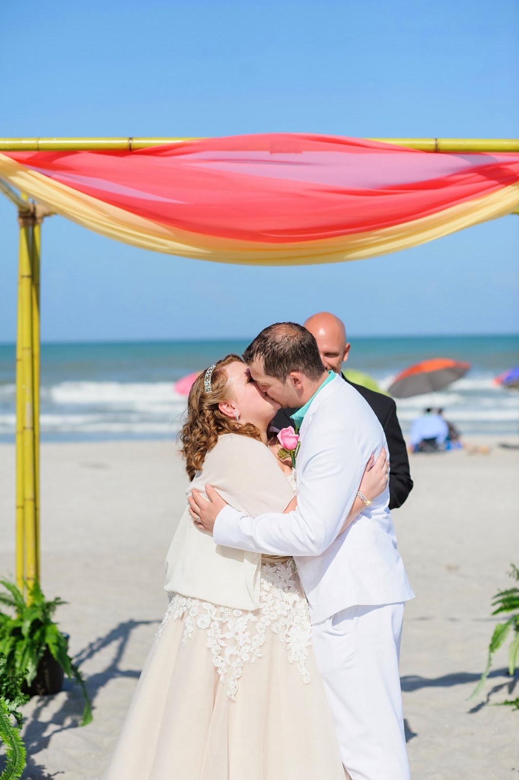 It was such a pleasure to be a part of Amy + Adam's intimate beach wedding. This adorable couple + their family traveled all the way from the U.K to celebrate their wedding at the DoubleTree Hilton in Cocoa Beach... + what a beautiful wedding it was! Their bright pink + orange color scheme fit perfectly with their sunset wedding. There's nothing like exchanging vows with the sand between your toes!